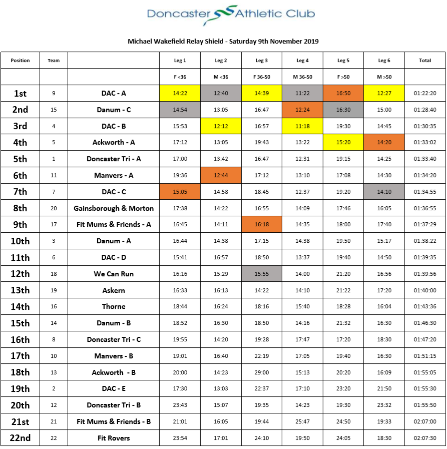 Results from Sundays Relays – 10 November 2019 Posted on November 12, 2019 by martin in News | 0 Comments Tweet Leg positions 1st place – yellow 2nd place – grey 3rd place – brown Tweet