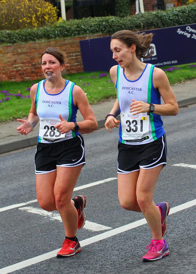 ents said this was a flat course. It did not feel flat! Kate and I really wanted a sub 2 hour time and set out to run 9 minute miles. We got a bit giddy at the start and ran a bit faster. We then had a problem with stitch for a few miles (if anyone has advice on how to prevent stitch and how to get rid of it please let us know!). After the 4.5 mile water station we had settled in to a steady pace. There was a great section of doubling back which we enjoyed as we like watching other runners and looking out for people we know. We saw Nick who was about 5 mins ahead of us and Rob who was just behind. We also saw George, Caz and Janet – all running really well. The hill at mile 10 nearly killed me, and Kate did a great job of keeping me going. We didn’t speak for the last 3 miles – just kept our eyes on the road and one foot in