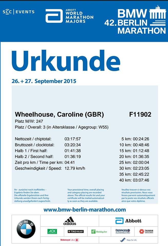 Caroline Wheelhouse ran an amazing race at the Berlin Marathon, her performance ranks her 2nd in her age group for the UK in 2015.